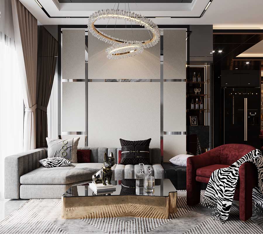 Cách bố trí không gian phòng khách khá đơn giản nhưng lại vô cùng hút mắt. Nó được thể hiện qua bộ ghế sofa, ghế armchair, bàn trà và đèn chùm lóng lánh. Ngoài ra, để tạo nên sự chấm phá thì các kiến trúc sư đã ốp vách tường rồi sau đó điểm xuyết các đường chỉ ánh kim. Giúp thể hiện rõ đường nét mạnh mẽ nhưng không kém phần tinh tế.