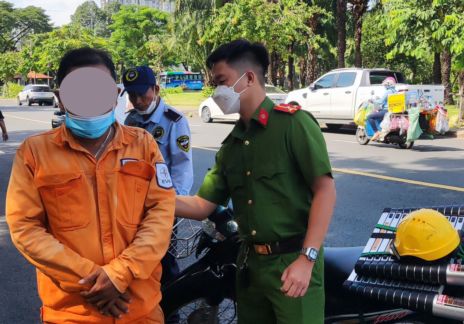 Hai đối tượng chạy xe máy đến đường Tân Phú thì bị bảo vệ Phú Mỹ Hưng tiếp cận, yêu cầu dừng xe lại xác minh thông tin. Sau khi kiểm tra, bảo vệ phát hiện tên của đối tượng trên Căn cước công dân và tên thêu trên áo nhân viên điện lực khác nhau. Bảo vệ đã bàn giao hai đối tượng cho công an phường Tân Phú xử lý.